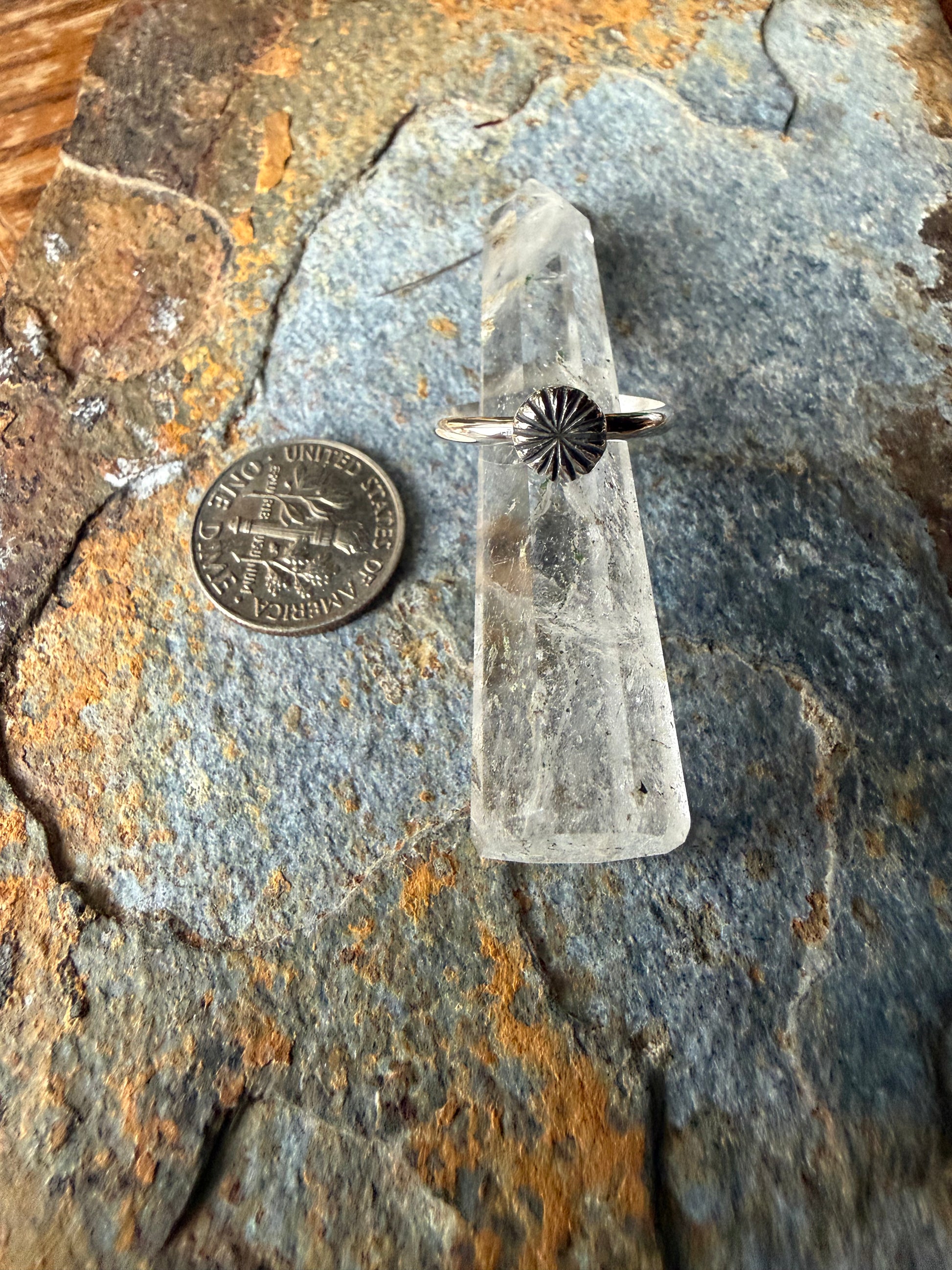 Handcrafted in sterling silver, the detailed sunburst concho design gives it that timeless Southwest feel — rustic, simple, and effortlessly stylish. Its petite size makes it perfect for stacking with your favorite turquoise and silver rings, or wearing solo for a subtle Western statement.
