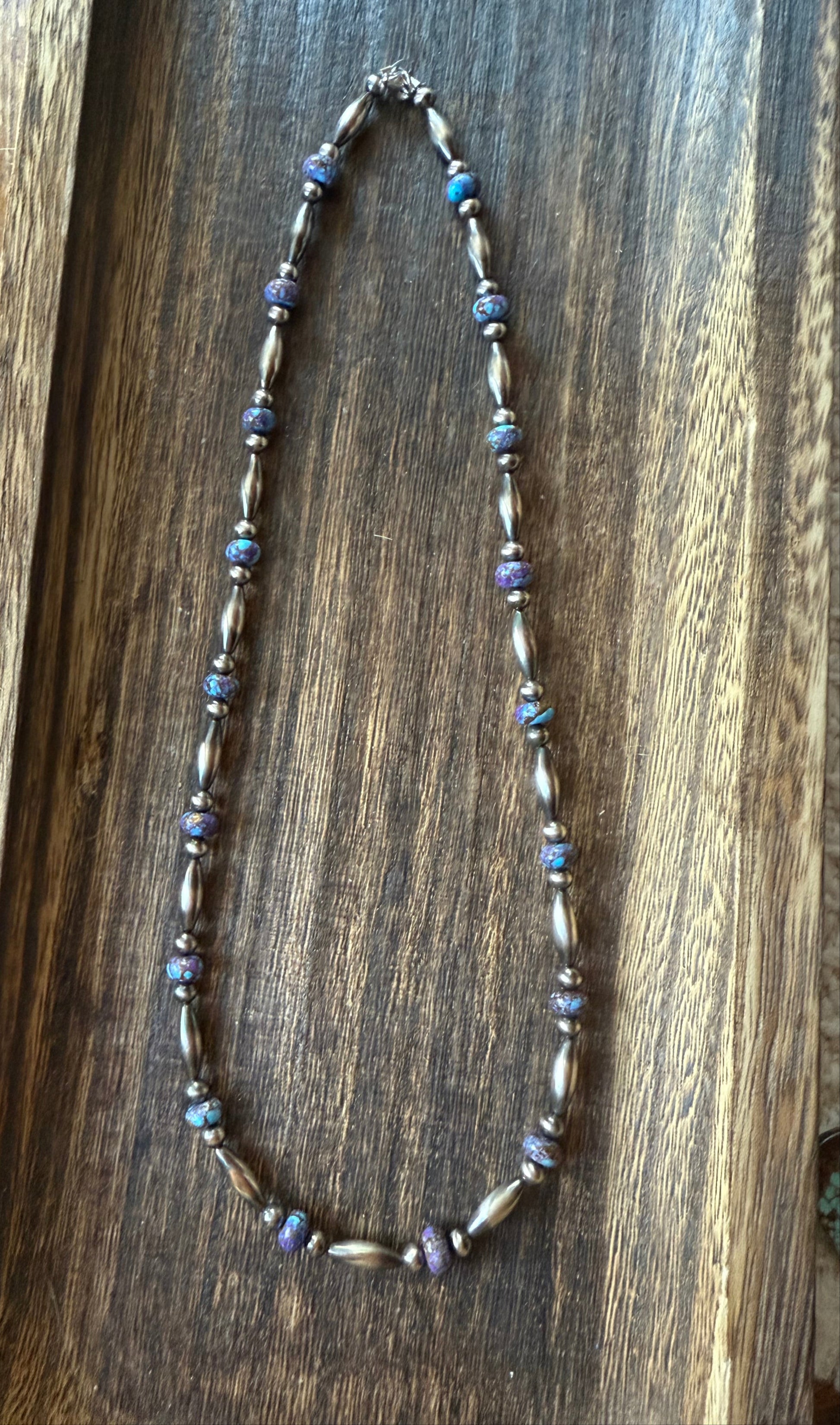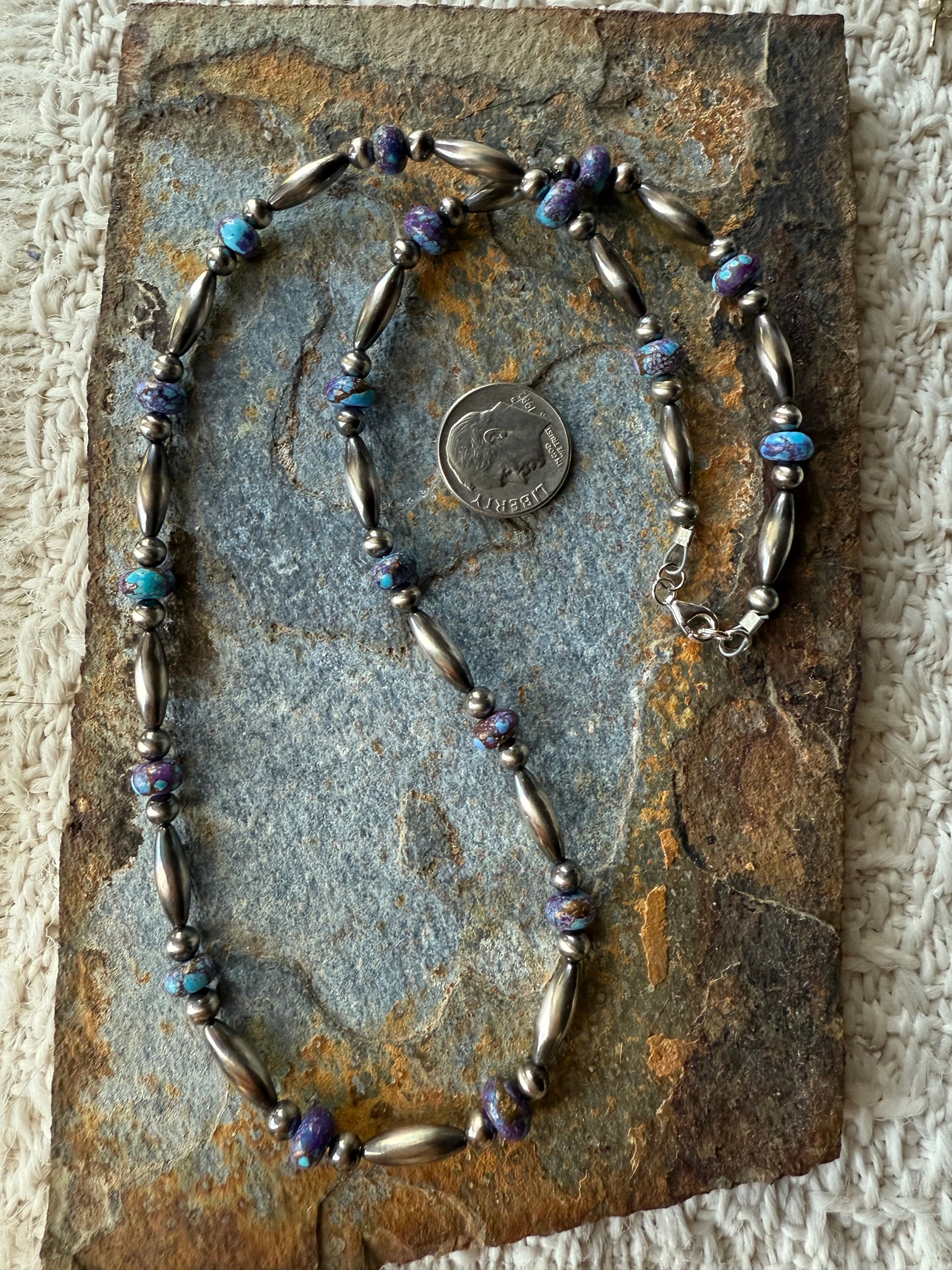 This handcrafted 18-inch necklace showcases vibrant Purple Mohave stones paired with luminous sterling silver pearls. Each stone’s rich purple hue and delicate copper veining create a striking contrast against the polished silver, blending Southwestern flair with modern elegance. Perfect for layering or wearing solo, this piece adds a bold pop of color to any look.